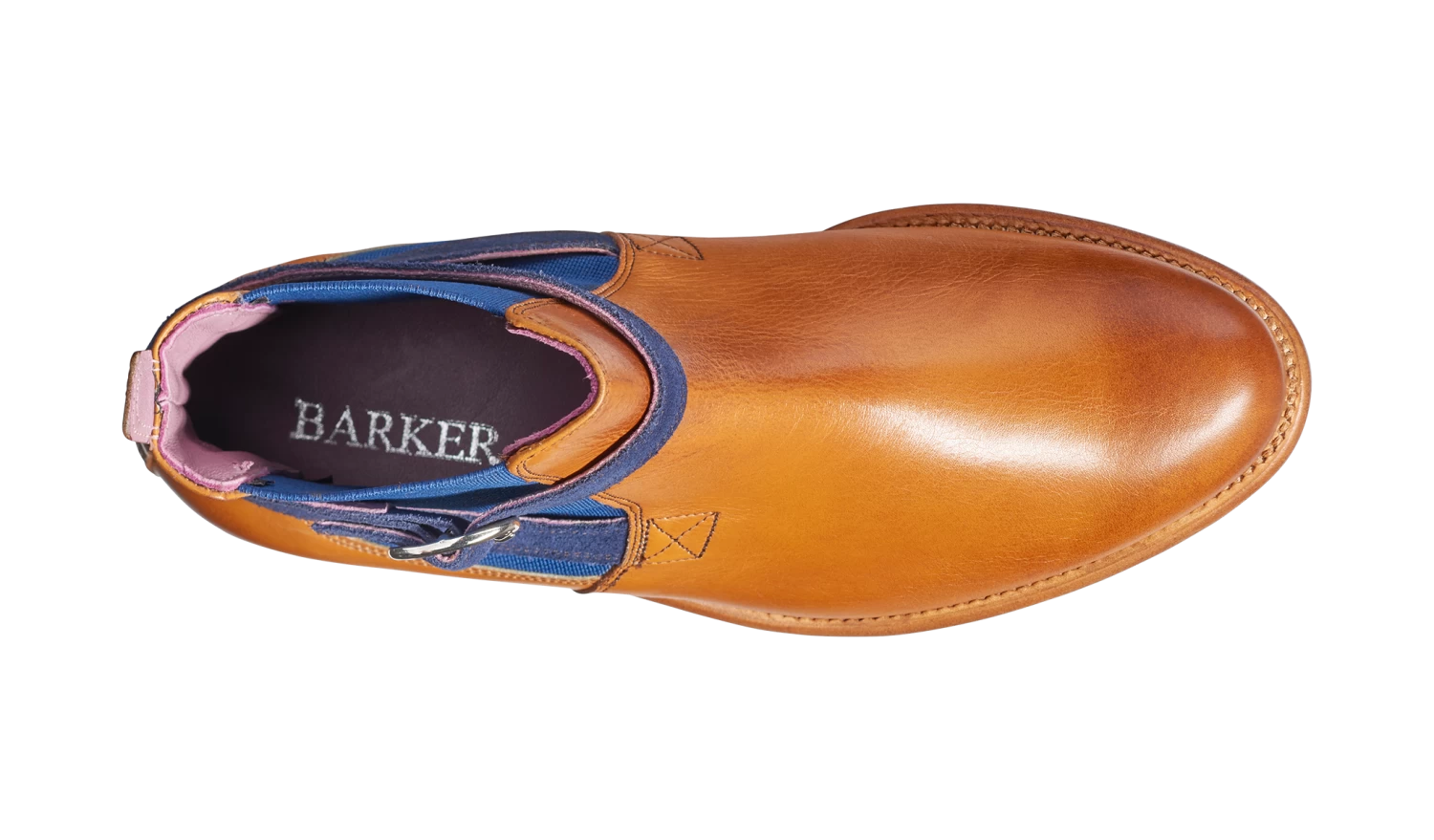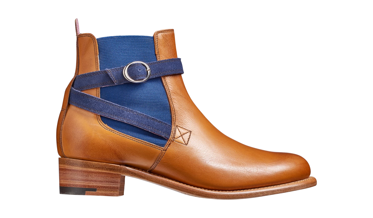 A modern suede boot with buckled strap and side gusset detail on an elegant Cuban heel.